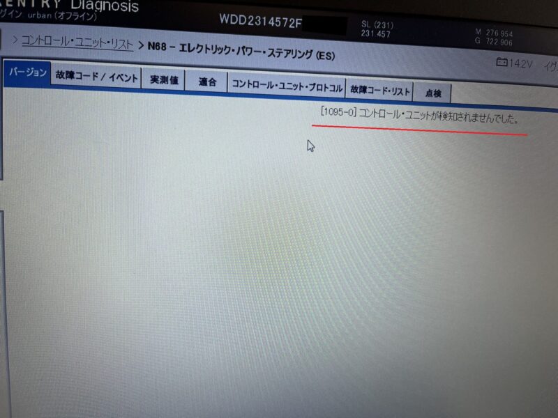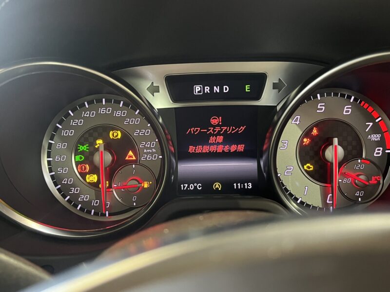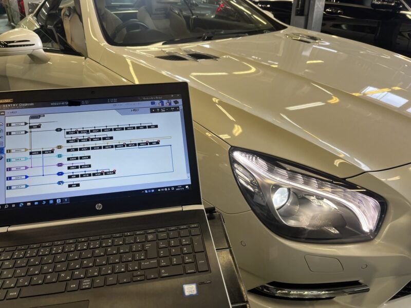 時折、エンジン始動直後や走行中に各種警告ランプが点灯し、パワーステアリングの故障メッセージが表示されていまう、R231モデル/ベンツSL350の診断/修理作業です。