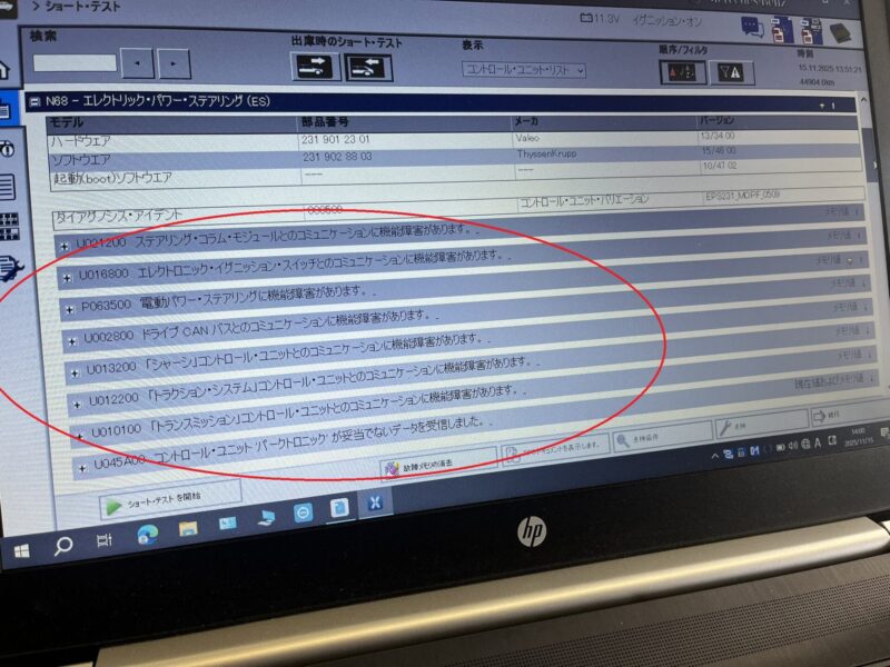常時症状が発生している状態でなく、入庫時のテスター診断時には症状が発生していない状態だったのでショートテストを行うと、各ECU機能障害に対するネットワークエラーが履歴にて検知されています。