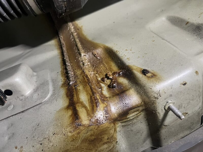 その周辺のフロア周りには、等速ジョイント部より飛び散ったグリスによって汚れてしまっています。