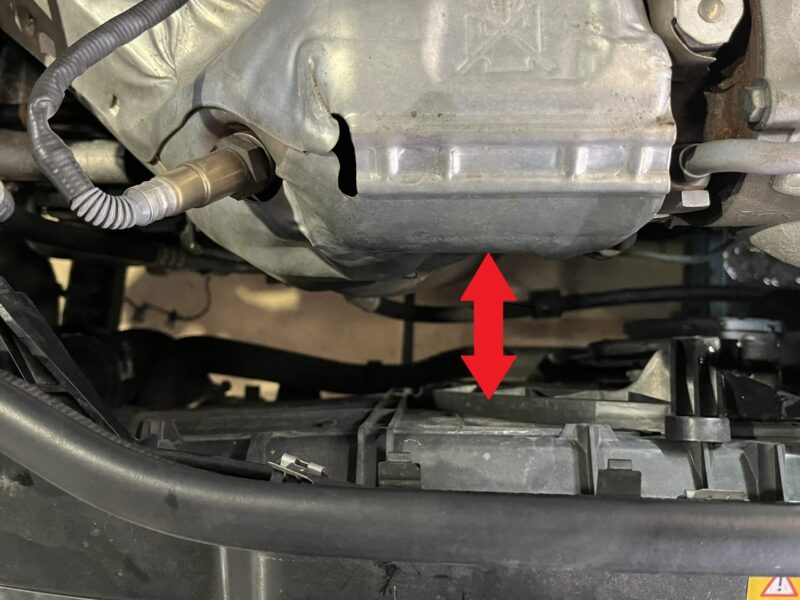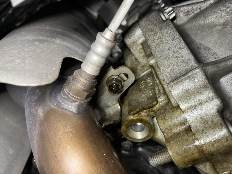 リフトアップするとエンジン後方部に、そのオイル漏れの痕跡が確認できます。