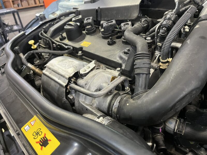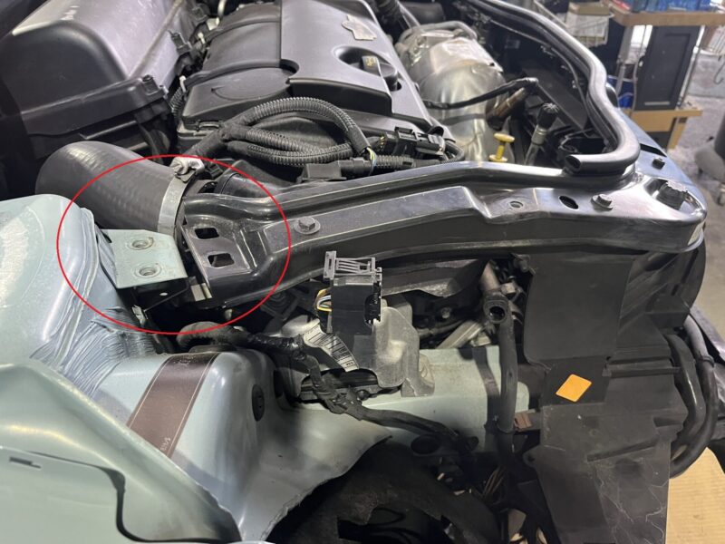 R55の狭いエンジンルームよりキャタライザー(触媒)を取り外すには、フロントフェイス廻りを分解/脱着した後にフロントサポートコンポーネントを前方へ移動してスペースを確保します。