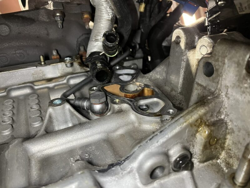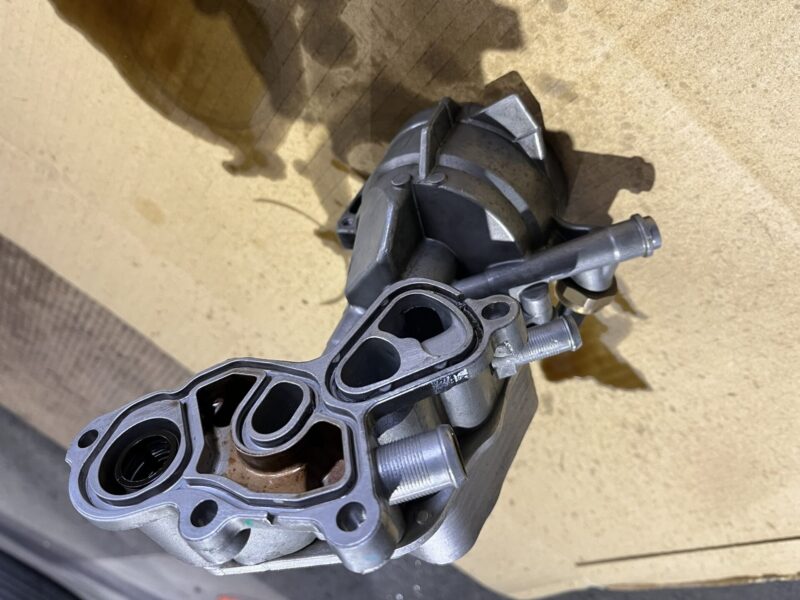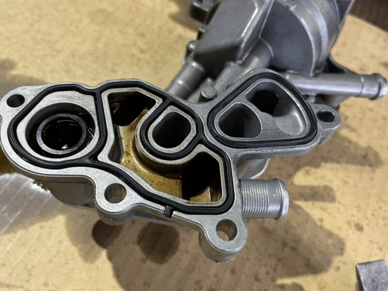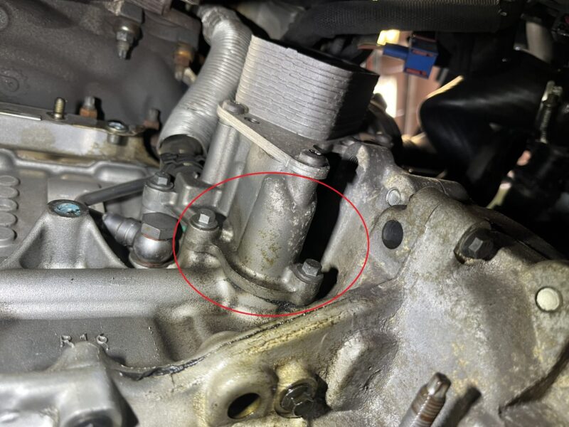 オイルエレメントハウジングの全貌を確認すると、エンジンブロック取付面よりオイル漏れが発生しているのが伺えます。