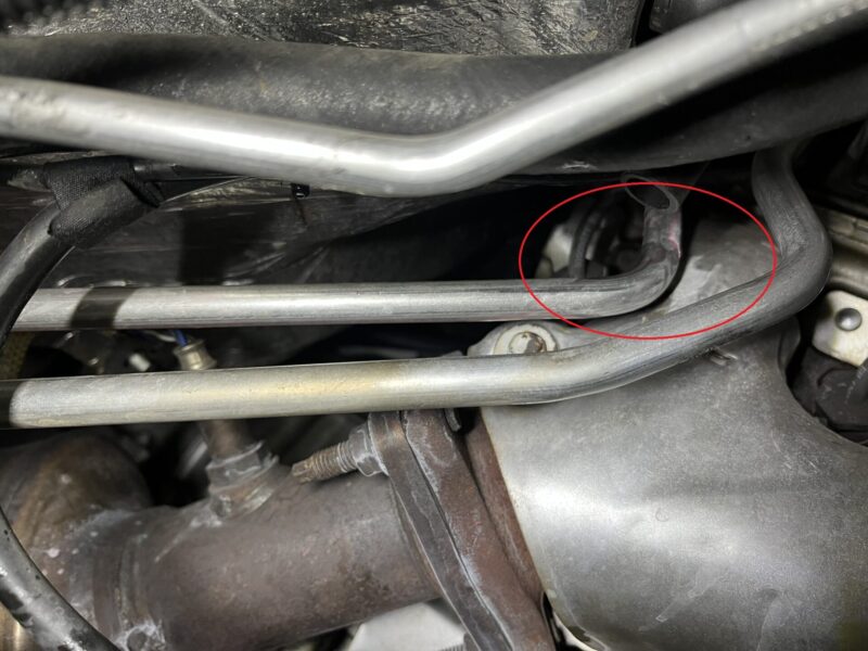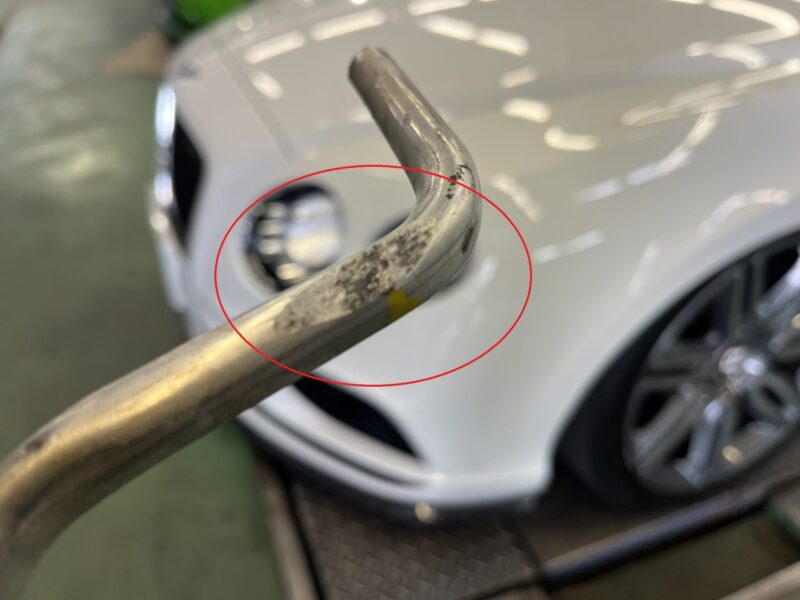 ヒーターパイプを確認したところ、2本(IN及びリターン)あるうちの1本がエキゾーストマニの遮熱板に接触しており、その箇所から水が滴り落ちてきているのが判明。