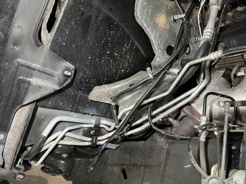 フロントウォーターラインから分岐されているリアヒーターラインの状態を確認する為、右側フロントフェンダーライナーを取り外して点検します。