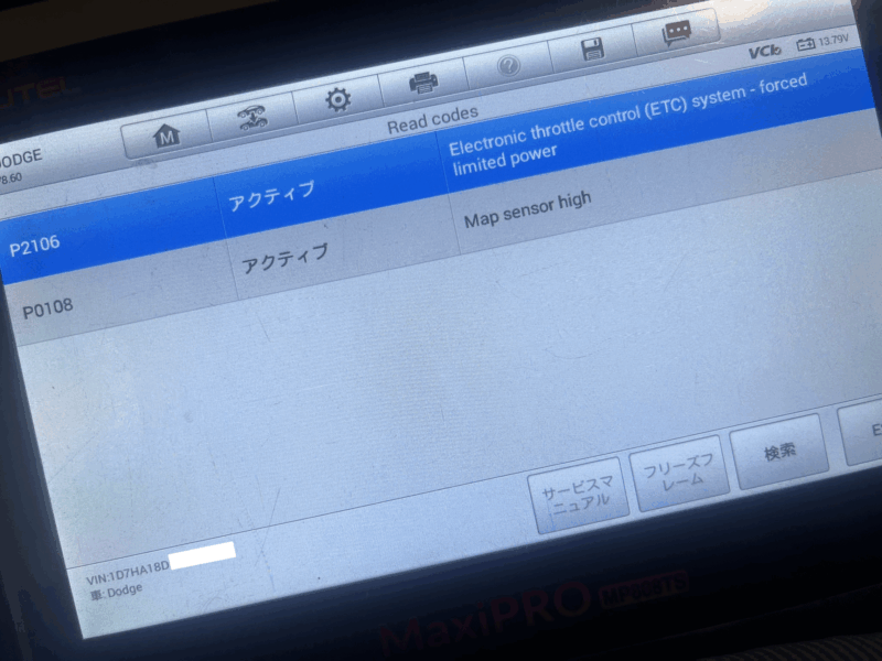 テスターにてDTC(故障コード)を確認すると、スロットルコントロールシステム及びMAPセンサー等のエラーがすぐに検知されてしまう状態です。
