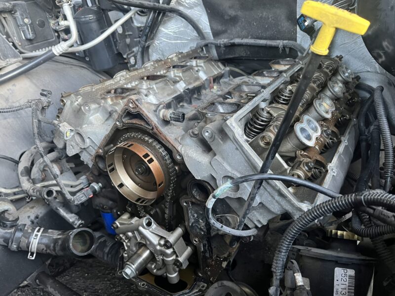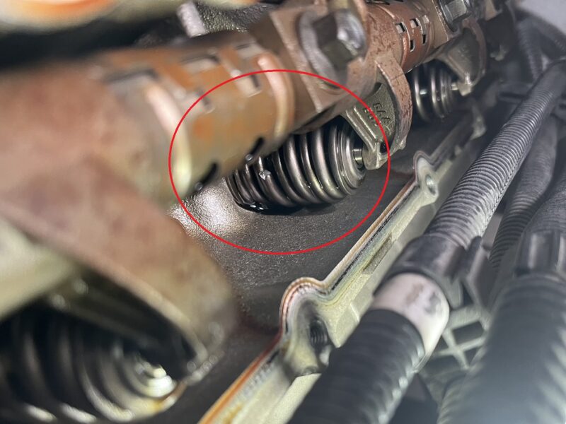 問題がとなる左バンクのバルブカバーを取り外して確認すると、圧縮圧力が存在していないNo3シリンダーのEXバルブ/スプリングが破損してしまっています。