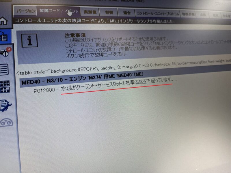 XENTRY診断機にてDTC(故障コード)を確認すると、水温がクーラントサーモスタットの基準とする温度値を下回っていると判明。
