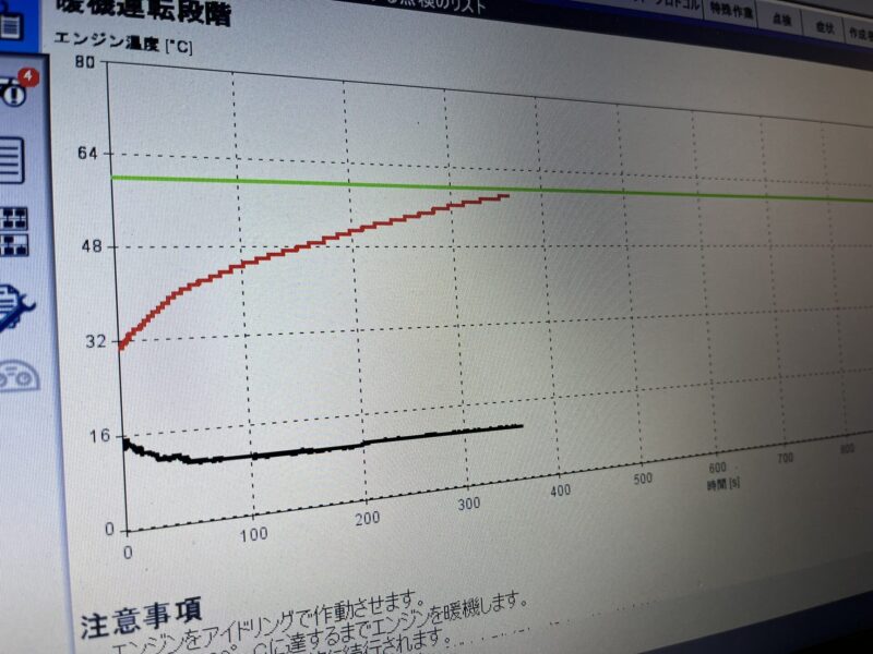 その電気的制御動作不良やサーモスタット弁の機械的リーク等により、ウォーターライン流量制御機能(遮断不良)に弊害が生じ、水温上昇時間が超過してしまっている状態です。