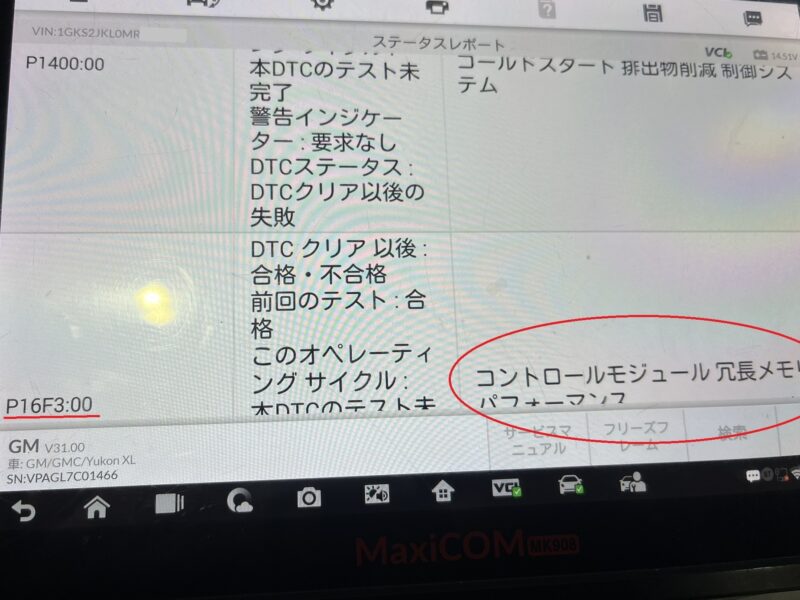 走行中に時折チェックエンジン警告ランプが点灯し、同時にサービストラクション等の警告メッセージも表示される症状が発生した、2021yGMCユーコンの診断です。