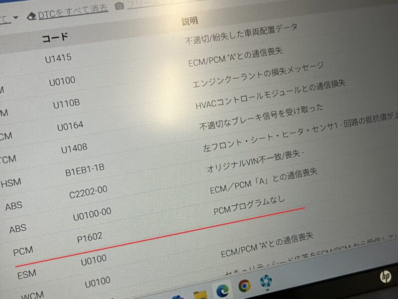 DTC(故障コード)を確認するとPCM(パワートレインコントロールモジュール)の通信喪失が履歴検知されており、実際症状発生時にはPCMが起動しない状態に陥っています。
