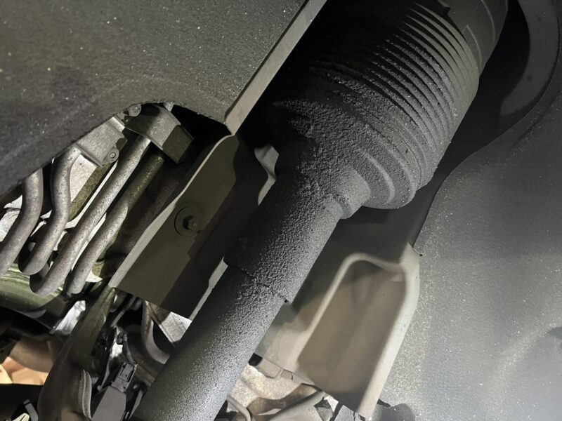 リフトアップして下廻り等を目視点検すると、左リアサスペンションのストラットからオイルリークの痕跡が確認できます。