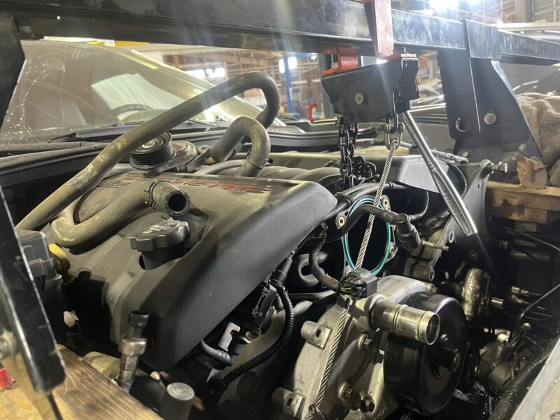 とは言え、コルベットのエンジンオイルパンはエンジンの低重心化を考慮してフロントメンバーとのクリアランスが少なく、車載状態でオイルパンだけを外そうとしてもフロントメンバーに干渉してしまいます。