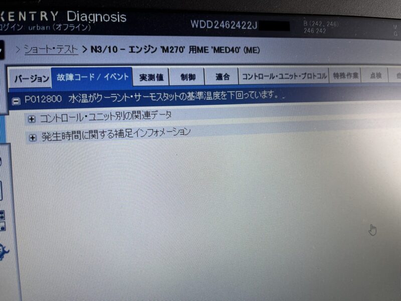 早速XENTRY診断機にてMEコントロールのDTCを確認すると、水温がクーラントサーモスタットの基準温度を下回っているのが検知されています。