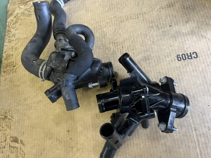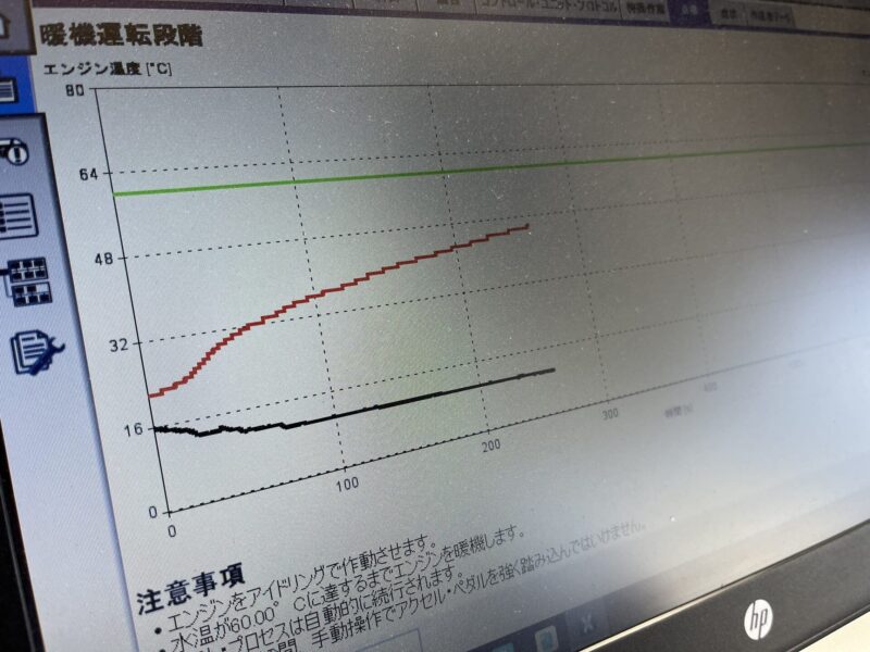新たなクーラントサーモスタットユニットへの組み換え後は、冷間時からの暖機運転段階を計測し、ECU制御基準値内での水温変動値を確認して作業完了となります。