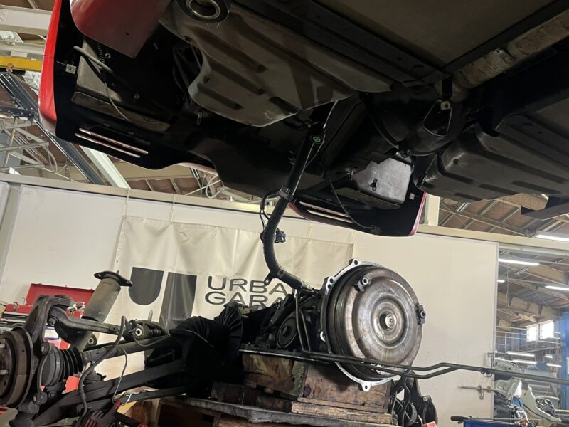 このコルベットに採用されているトルクチューブ方式プロペラシャフトは、外部にユニバーサル等のジョイントが無くシャフトがケースに覆われている一体構造なので、リアトランスアクスルから順番に取り外していく必要性があります。