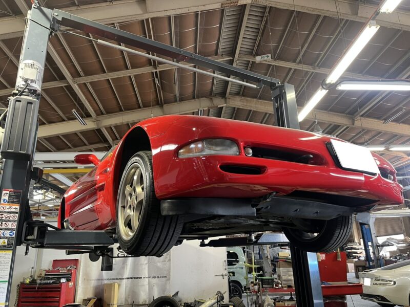 アクセル操作にてエンジン回転数を上げると、下廻り周辺より「ガランガラン…」という異音が発生する、C5モデル/シボレーコルベットの修理作業です。