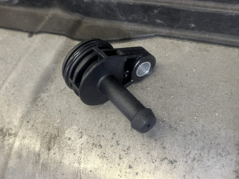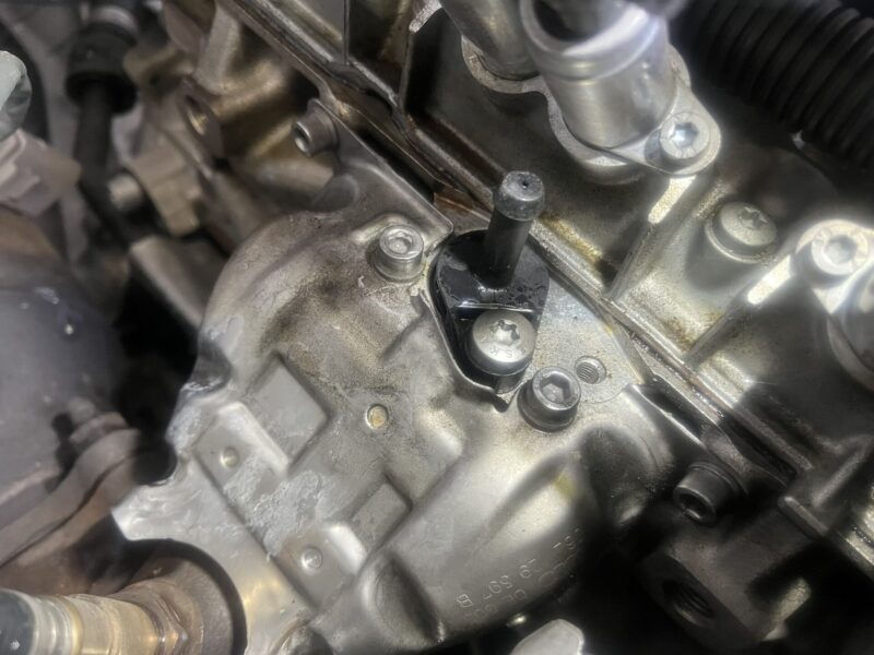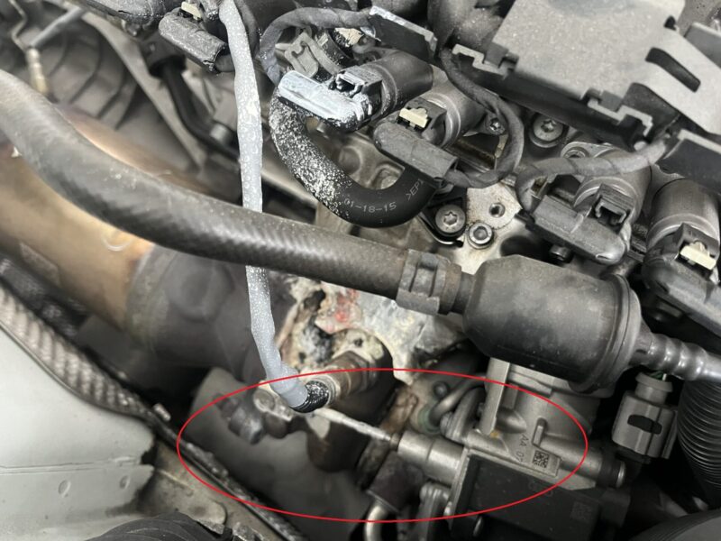 漏れ箇所はその上部に位置する冷却ラインの劣化損傷によって発生し、特にエキゾースト熱等の影響を受けやすいが為、樹脂製冷却ラインの劣化が進行しやすい状況ともいえます。