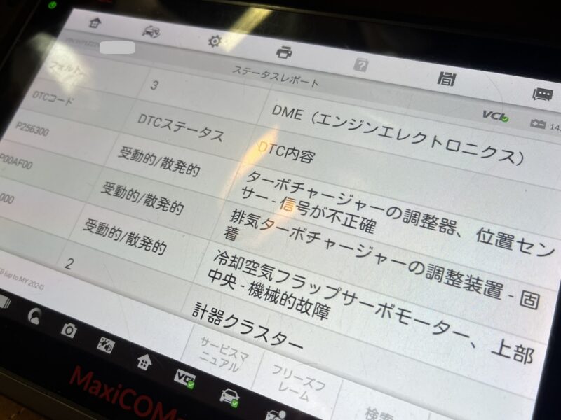 DME(エンジンエレクトロニクス)のDTC(故障コード)を確認すると、ターボチャージャーの調整装置に対する不具合が検知されています。