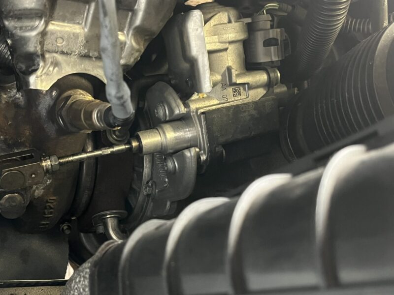 ターボチャージャーには過給圧を制御するアクチュエーターが備わっているのですが、現車のアクチュエーターロッド周辺は冷却水漏れによって異物(漏れた冷却水が固形化したもの)が固着してしまっています。