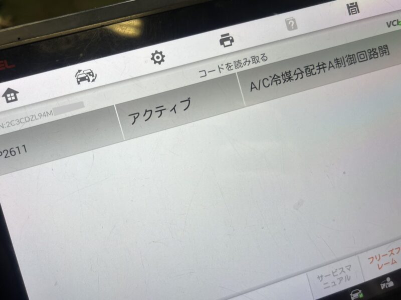 検知されているDTC(故障コード)を確認すると、A/C冷媒分配弁制御に対するエラーを検知しています。