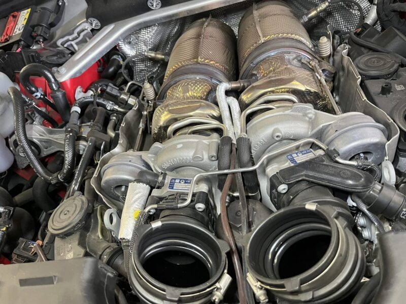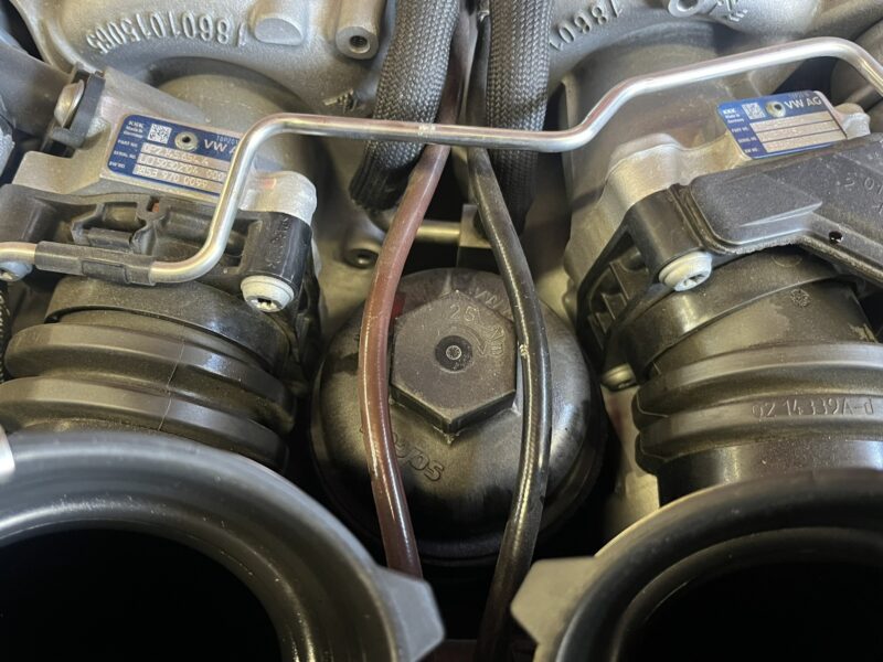 オイルエレメントはカイエン等と同様のホットインサイドレイアウトにツインターボが搭載されている為、エンジンルーム内を少し分解する必要性があります。
