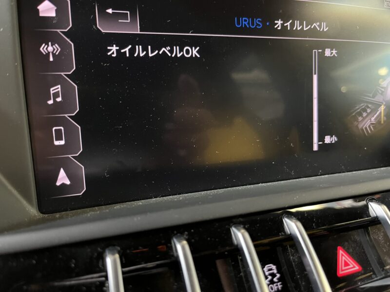 新たなオイルを注入後はモニターにてオイルレベルの測定、このウルスで大体約9L程度のオイルを必要とします(画像は約8.5L注入時のレベル)